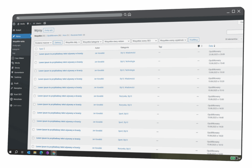 Zostań redaktorem własnego medium. Nie musisz być informatykiem, by skutecznie zarządzać swoim portalem! Po wdrożeniu projektu otrzymasz kompleksowe szkolenie z obsługi i prowadzenia strony, które krok po kroku pokaże Ci, jak dodawać artykuły, zarządzać zdjęciami, tworzyć sekcje, publikować wideo i promować treści.
