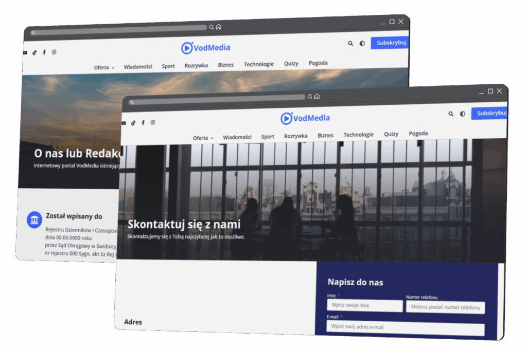 Każdy portal potrzebuje miejsca, w którym można pokazać ludzi, misję i wartości stojące za projektem. Dzięki stronie „O nas” oraz „Kontakt” Twoi czytelnicy, partnerzy i klienci zyskują bezpośredni dostęp do informacji o Tobie i sposobu, w jaki mogą się skontaktować.