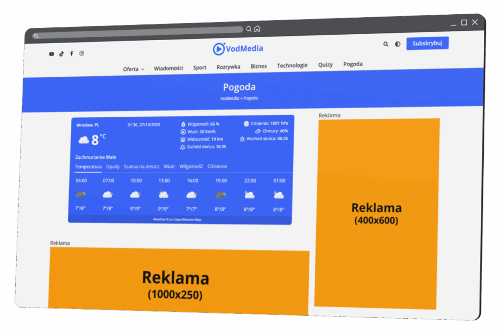 Dzięki wbudowanemu modułowi pogody Twoi czytelnicy otrzymują bieżące prognozy dla swojego regionu szybko, wygodnie i bez opuszczania Twojej strony.